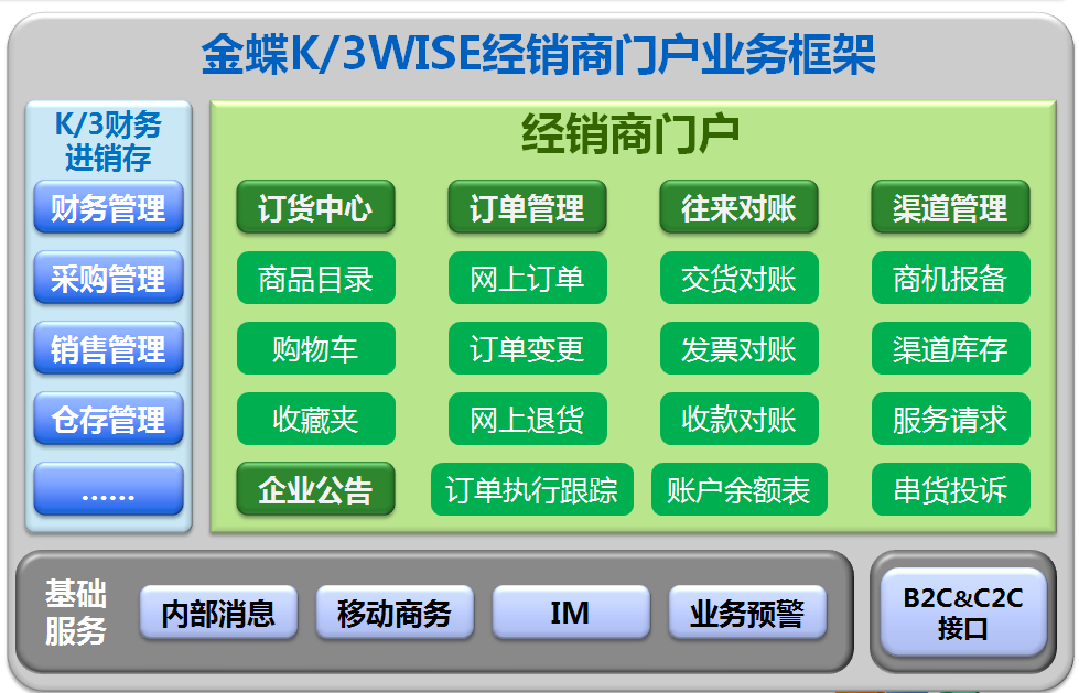 金蝶經(jīng)銷(xiāo)商管理解決方案 經(jīng)銷(xiāo)商管理系統(tǒng)主要以K/3WISE經(jīng)銷(xiāo)商門(mén)戶模塊為主,介紹經(jīng)銷(xiāo)商如何通過(guò)經(jīng)銷(xiāo)商門(mén)戶進(jìn)行溝通、訂貨、退貨、對(duì)賬等,形成金蝶K/3WISE經(jīng)銷(xiāo)商門(mén)戶解決方案。 適用企業(yè) 具有完整的經(jīng)銷(xiāo)商網(wǎng)絡(luò),希望提高經(jīng)銷(xiāo)商綜合管理水平,完善經(jīng)銷(xiāo)商業(yè)務(wù)的企業(yè) 企業(yè)特征 經(jīng)銷(xiāo)商訂貨量大,希望通過(guò)更快捷的方式下訂單 經(jīng)銷(xiāo)商希望能實(shí)時(shí)了解訂單狀態(tài) 經(jīng)銷(xiāo)商希望了解企業(yè)庫(kù)存,以免出現(xiàn)下單無(wú)貨的情況 供求雙方對(duì)賬業(yè)務(wù)繁雜,希望能方便快捷的處理對(duì)賬 企業(yè)希望能有效分析管理經(jīng)銷(xiāo)商庫(kù)存 適用行業(yè) 電子、機(jī)械、家電、五金等制造行業(yè)均可